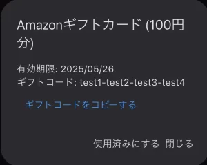 各ギフトをタップしていただくと、Amazonギフトカードの場合はギフトコードを、デジタルギフトⓇの場合はURLを確認していただけます。